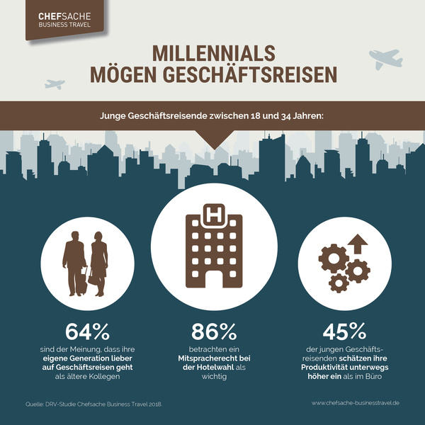 Von wegen die Generation Y achtet nur auf Work-Life-Balance: 45 Prozent der Geschäftsführer sagen, dass die 18- bis 34-jährigen Mitarbeiter die Belastung nicht scheuen und sogar lieber auf Dienstreisen gehen als die älteren Kollegen. Ein Grund: Fast jeder zweite junge Kollege schätzt seine Produktivität auf Reisen höher ein als im Büro. Doch die Jüngeren schauen auch genau hin, welche Extras ihr Arbeitgeber für sie bereithält. Zugfahrten erster Klasse, Bonusmeilen zur privaten Verwendung und ein schickes Hotel – das alles ist ihnen wichtig. Das sind Ergebnisse der aktuellen Umfrage „Chefsache Business Travel 2018“, einer Initiative von Travel Management Companies im Deutschen Reiseverband (DRV).