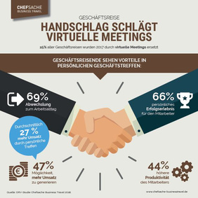 2017 wurde jedes vierte persönliche Treffen in deutschen Unternehmen durch ein virtuelles Meeting ersetzt. Und das, obwohl fast 50 Prozent der Fach- und Führungskräfte der Überzeugung sind, dass sich durch persönliche Treffen rund ein Drittel mehr Umsatz erzielen lässt. Aus Zeit- und Kostengründen wird dennoch zu Skype und Co. gegriffen. Das sind die Ergebnisse der aktuellen Umfrage "Chefsache Business Travel 2018", einer Initiative von Travel Management Companies im Deutschen Reiseverband (DRV), für die mehr als 200 Führungs- und Fachkräfte befragt wurden.