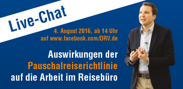 Sehr geehrte Damen, sehr geehrte Herren, wie wirkt sich die Pauschalreiserichtlinie auf das Geschäft von Reisebüros und Reiseveranstalter aus und was müssen sie beachten? Der DRV lädt erneut zu einem Experten-Live Chat zur Umsetzung der EU-Pauschalreiserichtlinie in deutsches Recht ein: am Donnerstag, 4. August 2016, ab 14:00 Uhr wird Rechtsanwalt Frank Hütten Ihre Fragen per Live-Video unter www.facebook.de/DRVDE beantworten. Wir freuen uns auf eine rege Beteiligung – bringen Sie sich ein! Ihre DRV-Newsletter-Redaktion |
