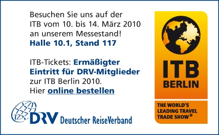 Die Veranstaltungen des DRV auf der ITB im ÜberblickDer Deutsche ReiseVerband (DRV) lädt seine Mitglieder und Interessenten zu verschiedenen Veranstaltungen, Vorträgen, Diskussionen und Gesprächen während der ITB Berlin ein. Neben dem Treffpunkt auf dem Messestand 117 in Halle 10.1 gibt es zahlreiche Veranstaltungen auf der Messe unter Beteiligung von DRV-Mitgliedern und Vorständen. |