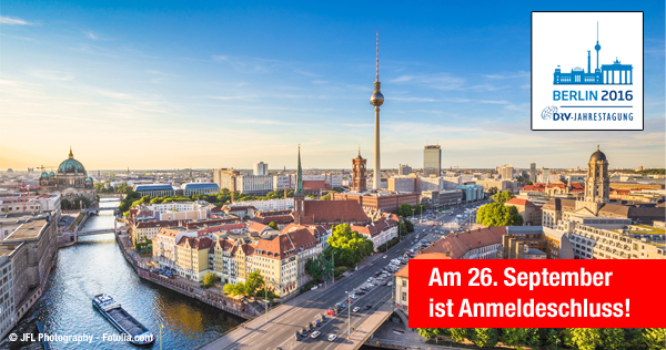Sehr geehrte Damen, sehr geehrte Herren, letzte Chance – der Anmeldeschluss zur DRV-Jahrestagung 2016 in Berlin ist der kommende Montag, der 26. September. WICHTIG: Nach diesem Termin ist eine Anmeldung leider nicht mehr möglich – es wird keine Verlängerung geben. Direkt zur Online-Anmeldung geht es hier: Am 29. Oktober finden während der Tagung tunusgemäß die Vorstandswahlen statt. Stimmen Sie ab und gestalten Sie die Zukunft mit. Sichern Sie sich ihre Teilnahme! Ihre DRV-Newsletter-Redaktion |