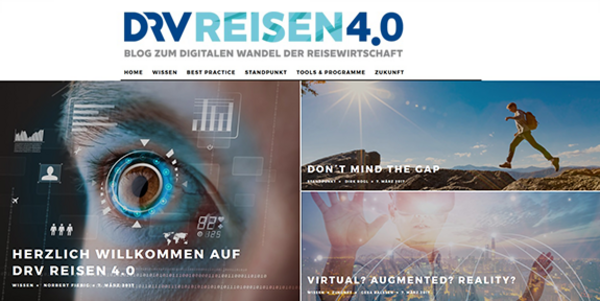 Herzlich Willkommen auf Reisen 4.0 – dem neuen DRV-BlogSehr geehrte Damen, sehr geehrte Herren, mit dem jetzt gestarteten DRV-Blog Reisen 4.0 möchten wir einen Kommunikations- und Diskussionskanal schaffen, der mit interessanten und praxisnahen Artikeln einen Einblick über die vielfältigen Themen aus dem Bereich der Digitalisierung im Tourismus liefert. Ihre DRV-Newsletter-Redaktion |